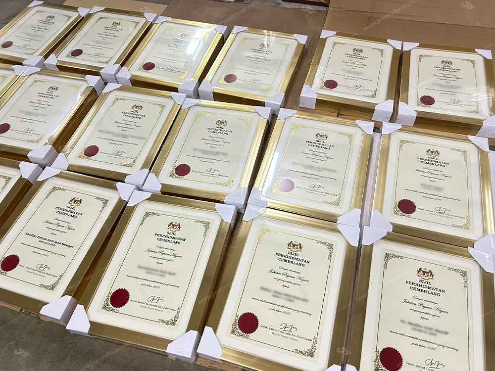 At the Attorney General’s Chambers of Malaysia, excellence in service deserves the highest recognition. PreMo was honoured to supply bespoke frames for their Outstanding Achievement Certificates, meticulously crafted to reflect the prestige of the department. These custom frames provide a sophisticated and professional display for the hard-earned accomplishments of its officers.